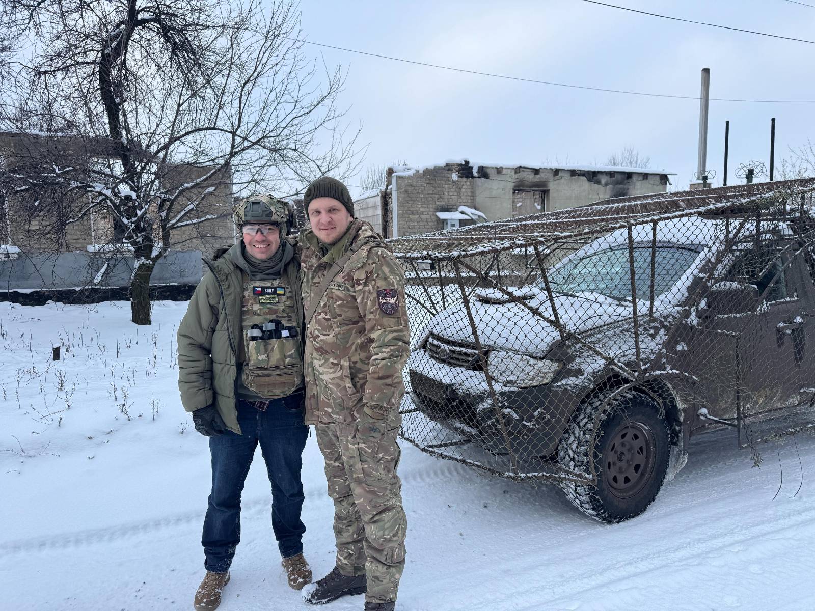 Jedeme záměrně jen dvě auta, abychom nebudili takovou pozornost. Je brzy ráno, tak i aktivita dronů je menší, ale i tak mám obavy. Projíždíme uličkami pobořené obce a po úzké zledovatělé cestě přes pole se vydáváme do vedlejší vesnice.
