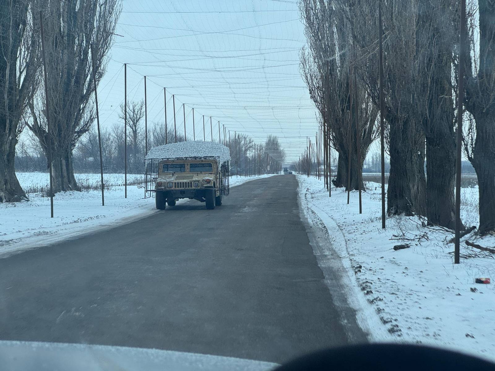 Vzdalujeme se od oblasti u Dobropilie po zamrzlých asfaltkách lemovaných protidronovými konstrukcemi se sítěmi, tu a tam pokroucenými a potrhanými od výbuchu dronu. Občas míjíme v protisměru opancéřovaný Humvee nebo tank T72 s protidronovou klecí. U odbočky na Novodoněcké se loučíme s mariňáky, tady už je významně menší pravděpodobnost, že se nám něco stane, byť ohořelé konstrukce sítí a občasné vraky aut tomu nenapovídají.