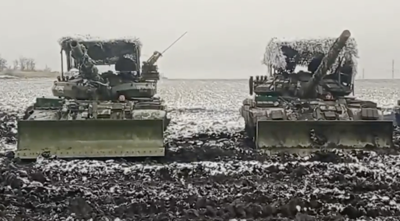 T-62M Obr.2022 (left) and T-62MV Obr.2022 (right) belonging to 5th Separate Guards Tank Brigade under 36th Combined Arms Army, Donetsk Oblast, 31 January 2024